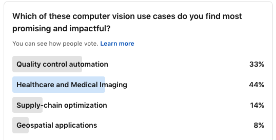 Last week, I conducted a comprehensive survey on LinkedIn, spanning over 3,000 individuals, to gauge their perspectives on the most promising and impactful computer vision use cases. Among the array of potential applications, it was particularly fascinating to note that Healthcare and Medical Imaging emerged as the clear frontrunners, with an impressive 36% of respondents expressing their enthusiasm for this domain.
